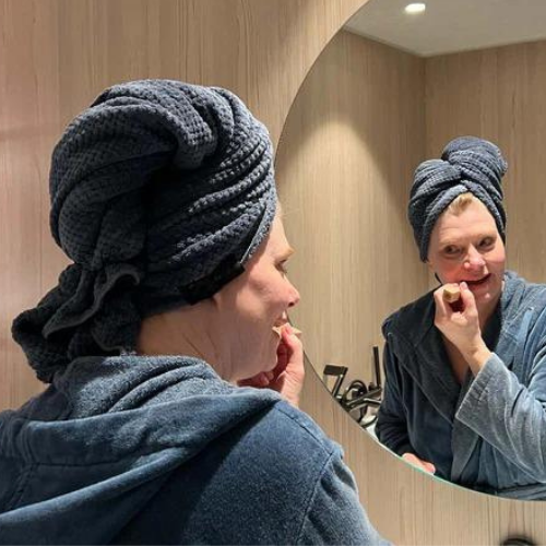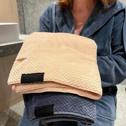 Das Handtuch hat ein elastisches Band, sodass Sie die Hände frei haben.